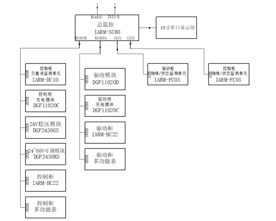 監(jiān)控部分采用集散方式對(duì)系統(tǒng)進(jìn)行監(jiān)測(cè)和控制,驅(qū)動(dòng)柜和控制柜的饋電的運(yùn)行狀態(tài)、電源模塊運(yùn)行參數(shù),分別由兩臺(tái)智能監(jiān)控系統(tǒng)采集處理,由監(jiān)控模塊統(tǒng)一處理后顯示在觸摸屏上,同時(shí)可通過人機(jī)交互操作方式對(duì)系統(tǒng)進(jìn)行設(shè)置和控制,還可接入遠(yuǎn)程監(jiān)控。監(jiān)控模塊還能對(duì)每個(gè)充電模塊進(jìn)行均/浮充控制、限流