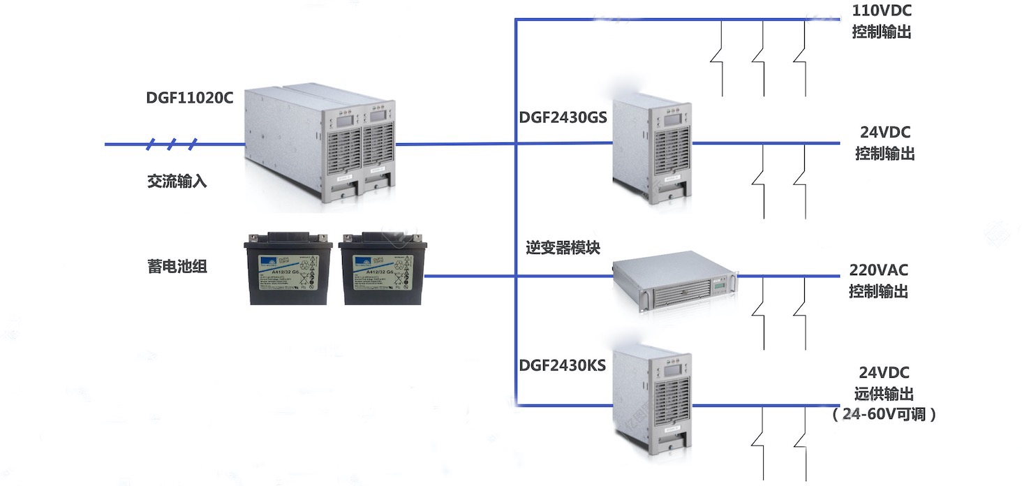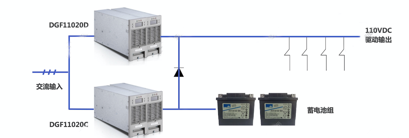 交流輸入正常時(shí),交流電源經(jīng)充電模塊輸出DC110V母線、母線上接UPS、24VDC降壓模塊24~56VDC可調(diào)模塊,同時(shí)給DC110V負(fù)載供電,充電模塊同時(shí)對(duì)蓄電池組進(jìn)行充電。一旦交流輸入中斷時(shí),充電模塊停止工作,蓄電池組直接向110VDC母線提供電力負(fù)荷,從而保證110VDC母線不間斷供電。