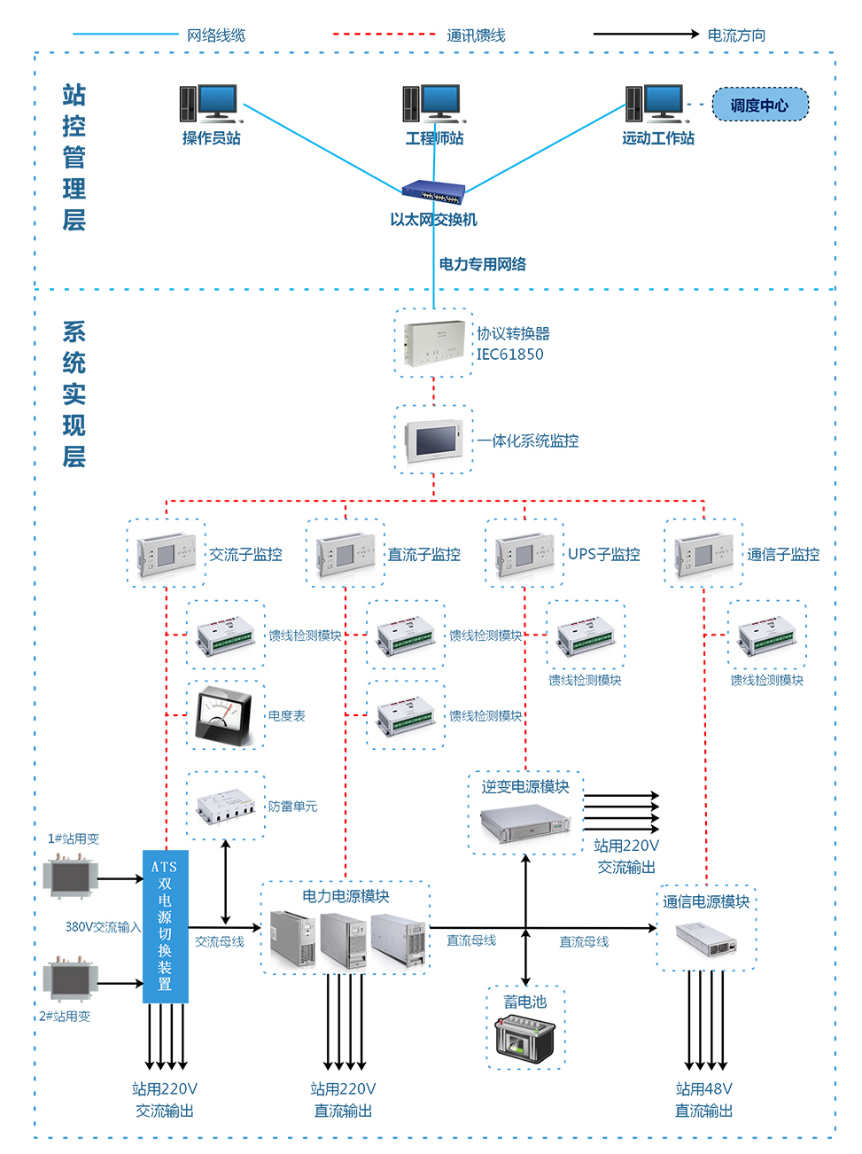一體化電源系統采用分散控制系統,模塊化結構,組屏簡單,配置靈活,統一化管理,冗余備份方式,極大的提高了系統的可靠性。